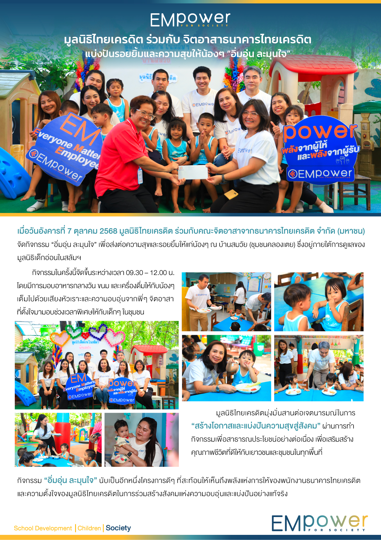 เมื่อวันอังคารที่ 7 ตุลาคม 2568 มูลนิธิไทยเครดิต ร่วมกับคณะจิตอาสาจากธนาคารไทยเครดิต จำกัด (มหาชน) จัดกิจกรรม “อิ่มอุ่น ละมุนใจ” เพื่อส่งต่อความสุขและรอยยิ้มให้แก่น้องๆ ณ บ้านสมวัย (ชุมชนคลองเตย) ซึ่งอยู่ภายใต้การดูแลของมูลนิธิเด็กอ่อนในสลัมฯ