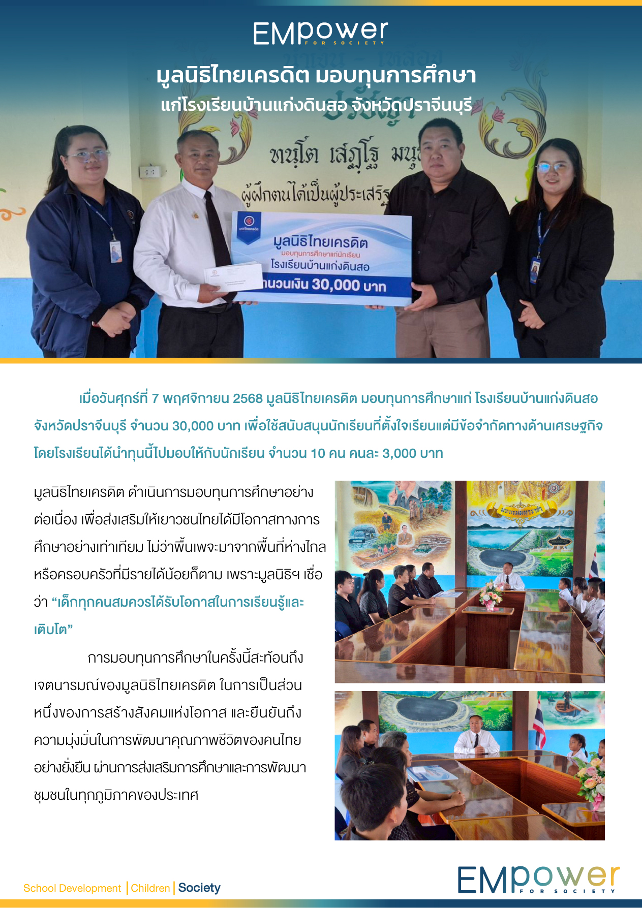 เมื่อวันศุกร์ที่ 7 พฤศจิกายน 2568 มูลนิธิไทยเครดิต มอบทุนการศึกษาแก่ โรงเรียนบ้านแก่งดินสอ จังหวัดปราจีนบุรี จำนวน 30,000 บาท เพื่อใช้สนับสนุนนักเรียนที่ตั้งใจเรียนแต่มีข้อจำกัดทางด้านเศรษฐกิจ โดยโรงเรียนได้นำทุนนี้ไปมอบให้กับนักเรียน จำนวน 10 คน คนละ 3,000 บาท