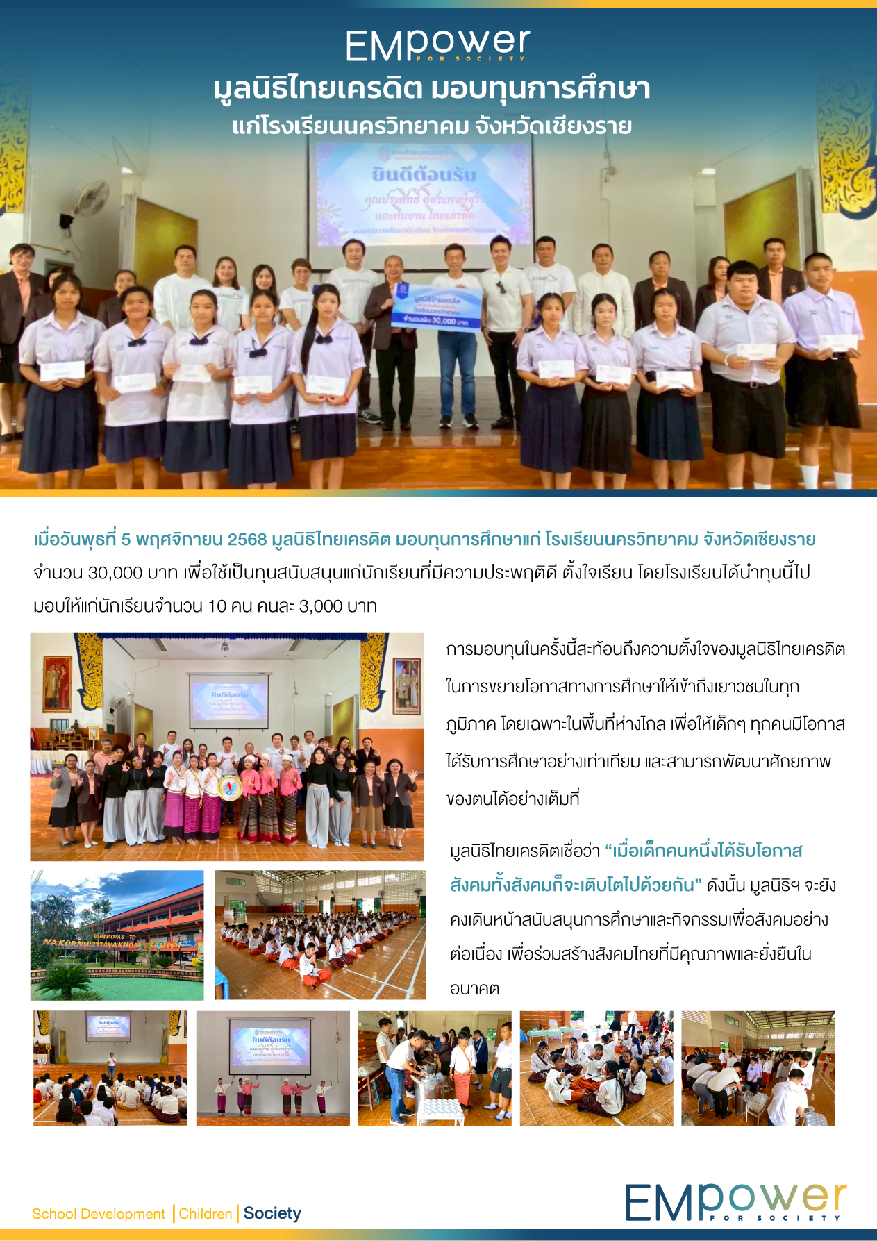 เมื่อวันพุธที่ 5 พฤศจิกายน 2568 มูลนิธิไทยเครดิต มอบทุนการศึกษาแก่ โรงเรียนนครวิทยาคม จังหวัดเชียงราย จำนวน 30,000 บาท เพื่อใช้เป็นทุนสนับสนุนแก่นักเรียนที่มีความประพฤติดี ตั้งใจเรียน โดยโรงเรียนได้นำทุนนี้ไปมอบให้แก่นักเรียนจำนวน 10 คน คนละ 3,000 บาท