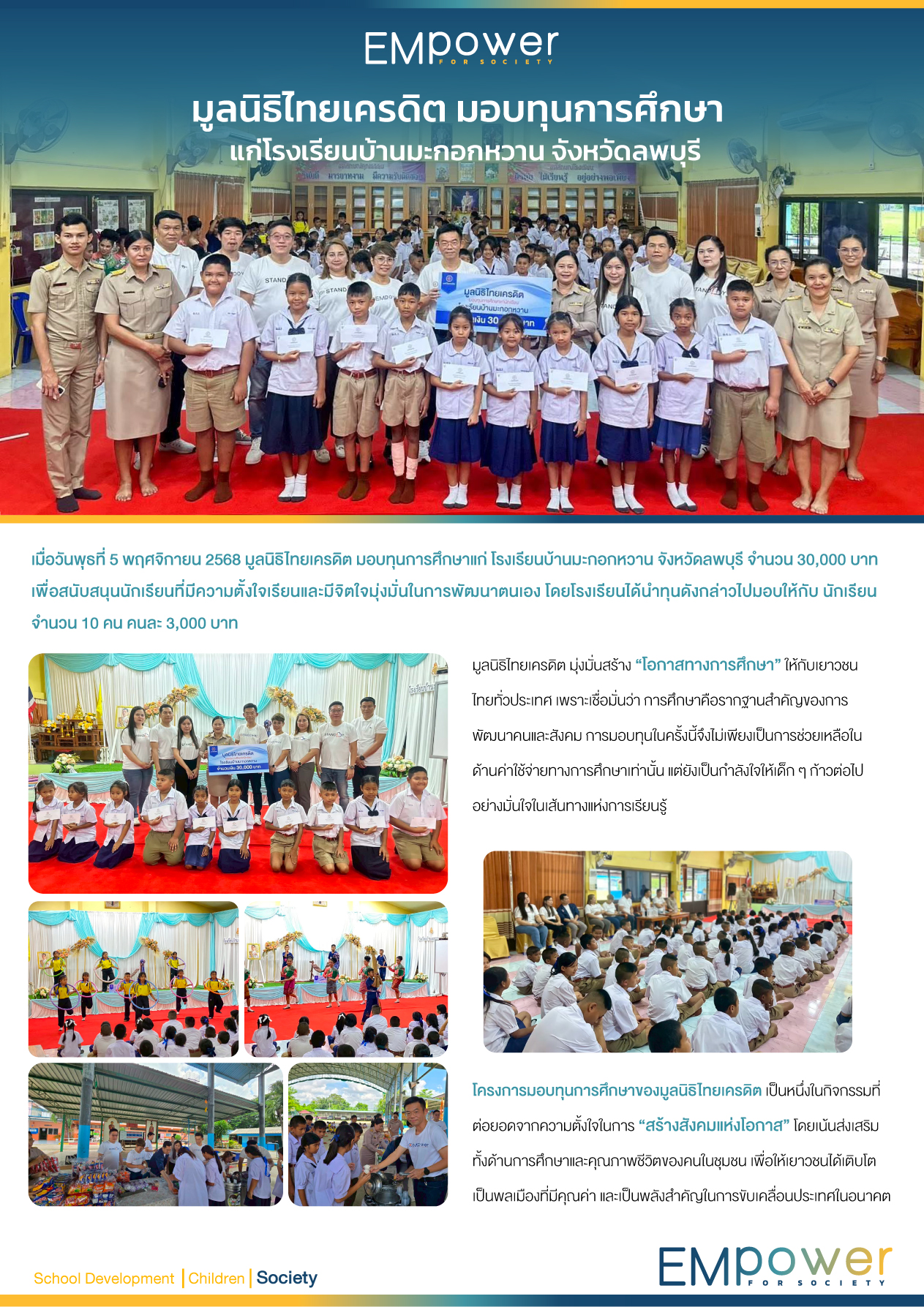 เมื่อวันพุธที่ 5 พฤศจิกายน 2568 มูลนิธิไทยเครดิต มอบทุนการศึกษาแก่ โรงเรียนบ้านมะกอกหวาน จังหวัดลพบุรี จำนวน 30,000 บาท เพื่อสนับสนุนนักเรียนที่มีความตั้งใจเรียนและมีจิตใจมุ่งมั่นในการพัฒนาตนเอง โดยโรงเรียนได้นำทุนดังกล่าวไปมอบให้กับนักเรียนจำนวน 10 คน คนละ 3,000 บาท
