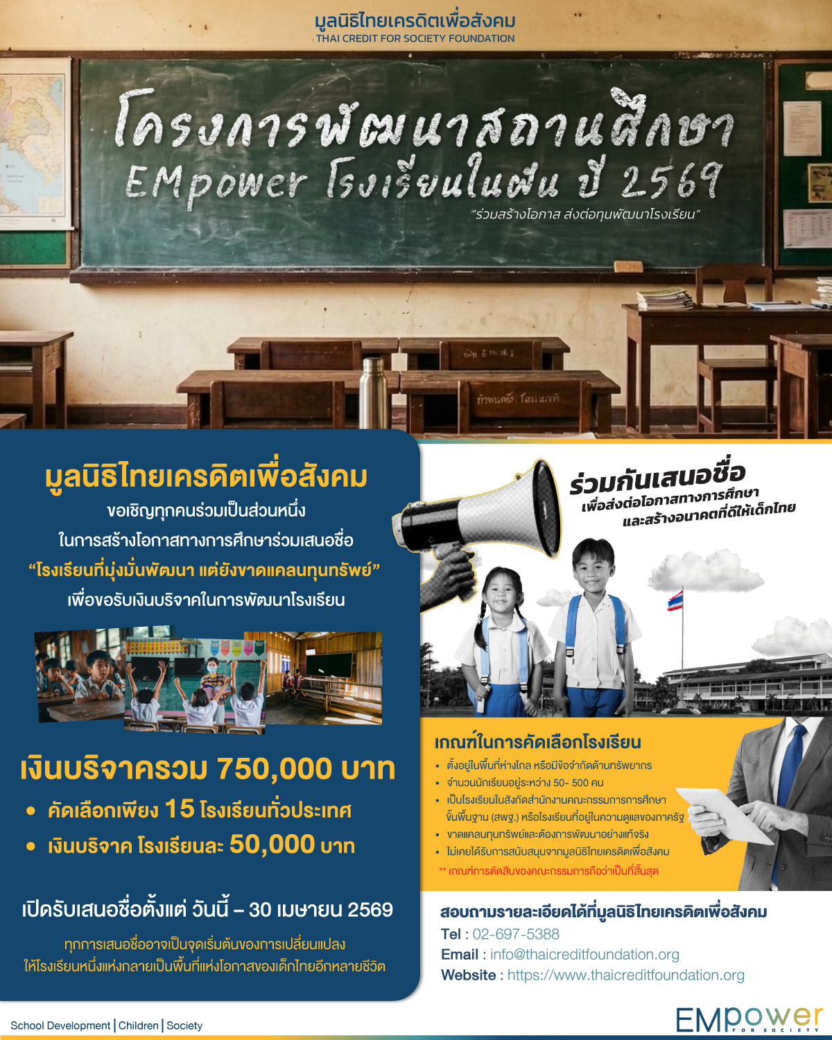 มูลนิธิไทยเครดิตเพื่อสังคม ขอเชิญร่วมเสนอชื่อโรงเรียนที่ขาดแคลนทั่วประเทศ ภายใต้ “โครงการพัฒนาสถานศึกษา EMpower โรงเรียนในฝัน ปี 2569”