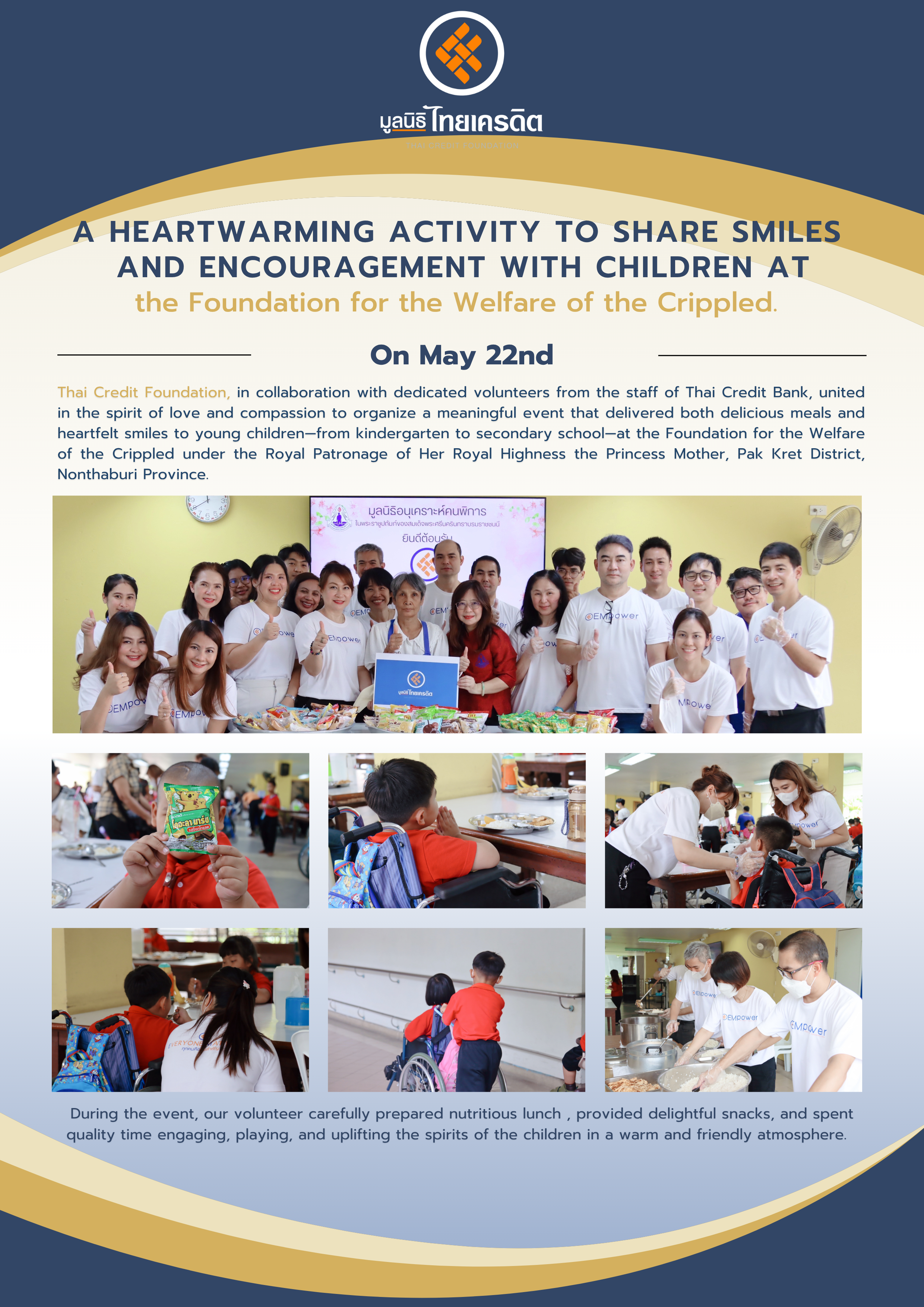 On May 22nd, Thai Credit Foundation, in collaboration with dedicated volunteers from the staff of Thai Credit Bank, united in the spirit of love and compassion to organize a meaningful event that delivered both delicious meals and heartfelt smiles to young children—from kindergarten to secondary school—at the Foundation for the Welfare of the Crippled under the Royal Patronage of Her Royal Highness the Princess Mother, Pak Kret District, Nonthaburi Province.