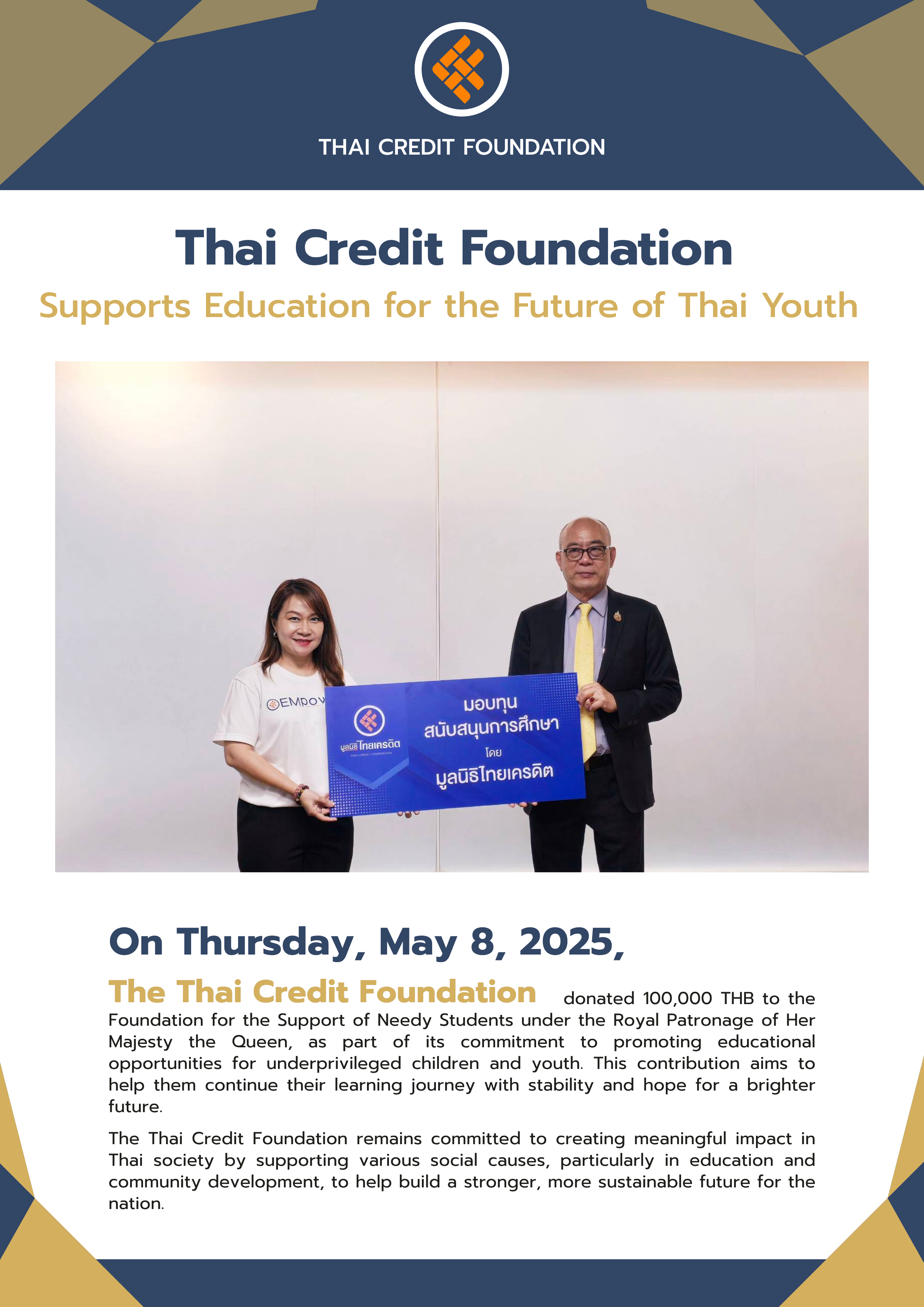 On Thursday, May 8, 2025, the Thai Credit Foundation donated 100,000 THB to the Foundation for the Support of Needy Students under the Royal Patronage of Her Majesty the Queen, as part of its commitment to promoting educational opportunities for underprivileged children and youth. This contribution aims to help them continue their learning journey with stability and hope for a brighter future.