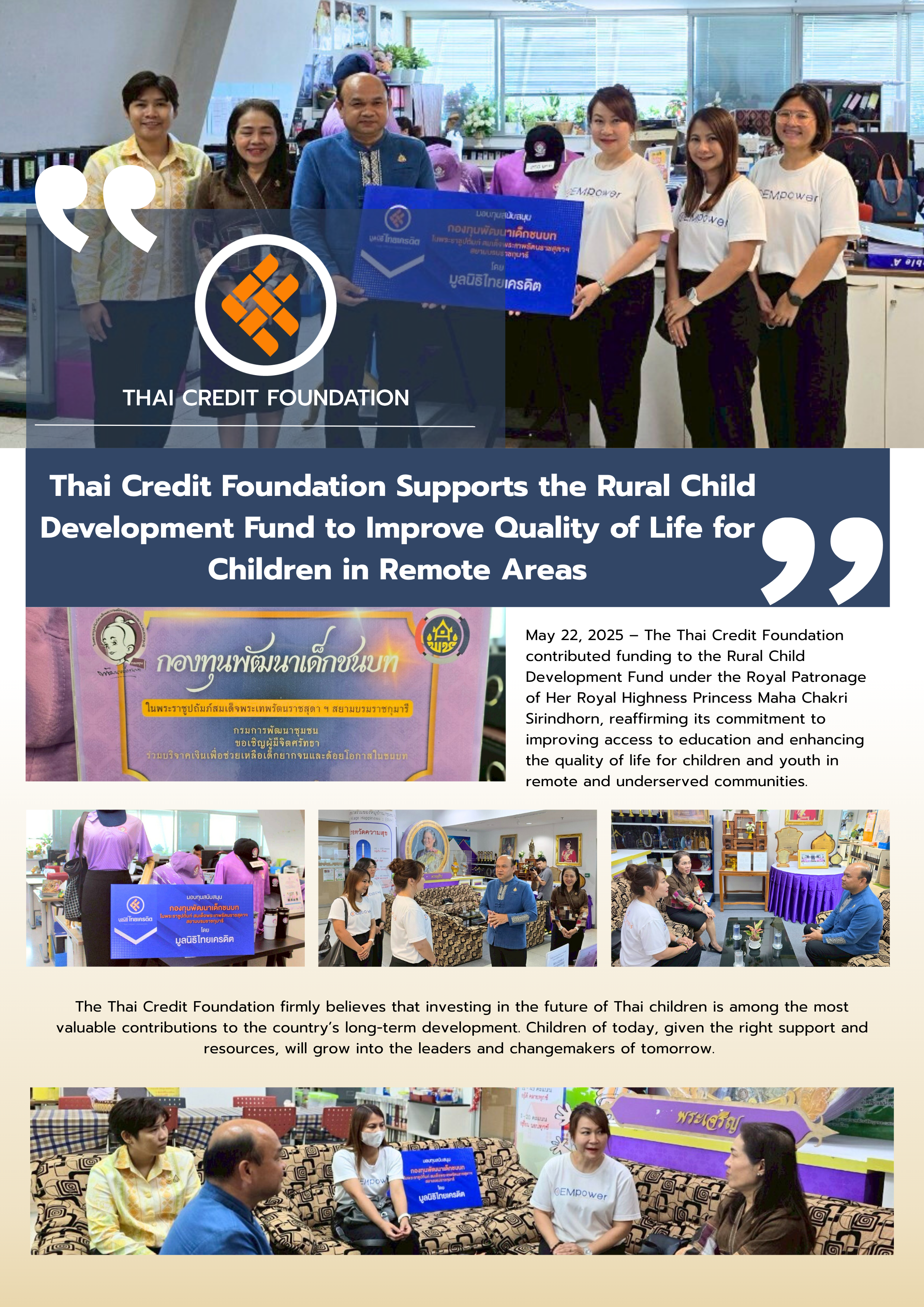 May 22, 2025 – The Thai Credit Foundation contributed funding to the Rural Child Development Fund under the Royal Patronage of Her Royal Highness Princess Maha Chakri Sirindhorn, reaffirming its commitment to improving access to education and enhancing the quality of life for children and youth in remote and underserved communities.