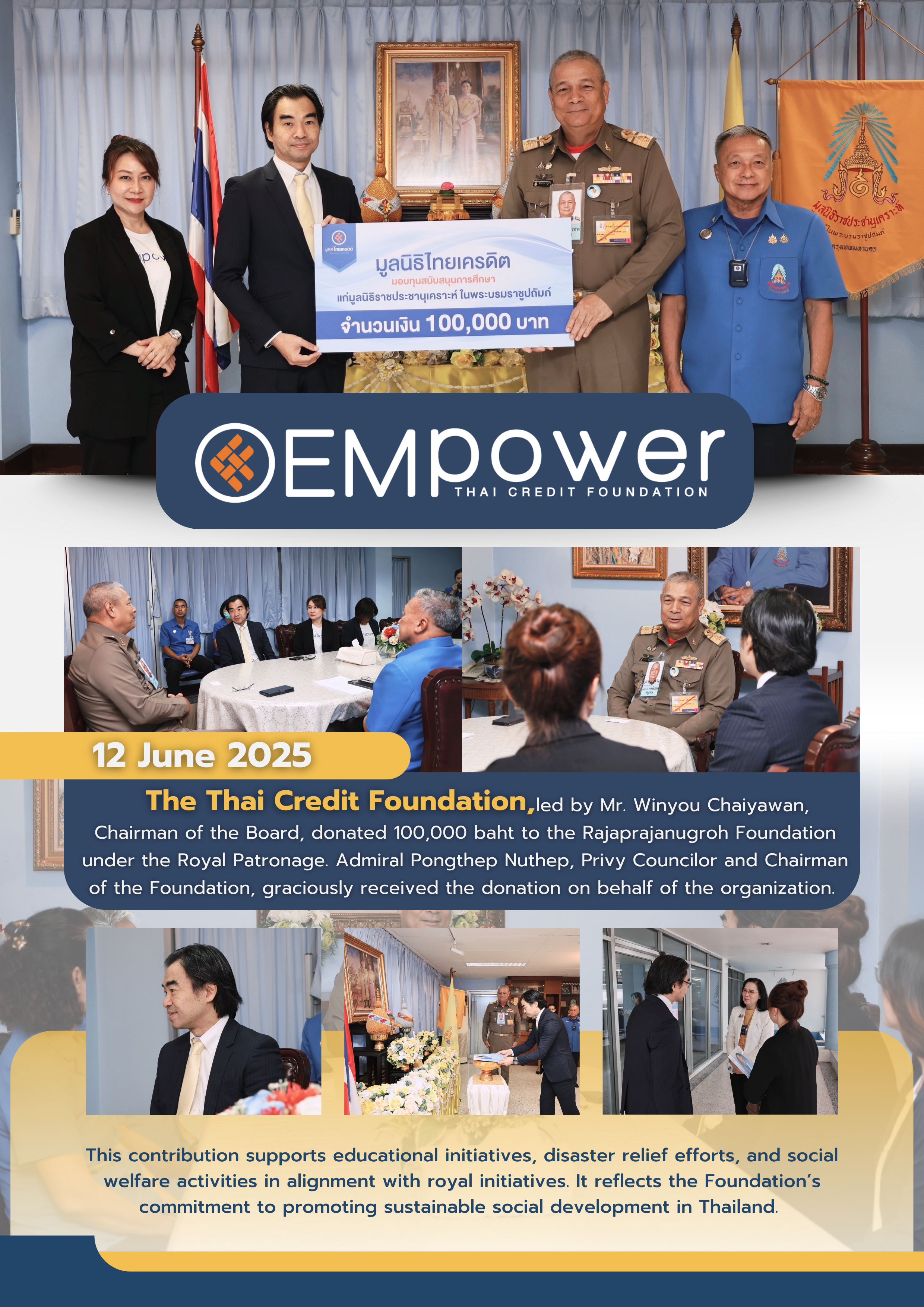 Bangkok, 12 June 2025 – The Thai Credit Foundation, led by Mr. Winyou Chaiyawan, Chairman of the Board, donated 100,000 baht to the Rajaprajanugroh Foundation under the Royal Patronage. Admiral Pongthep Nuthep, Privy Councilor and Chairman of the Foundation, graciously received the donation on behalf of the organization.