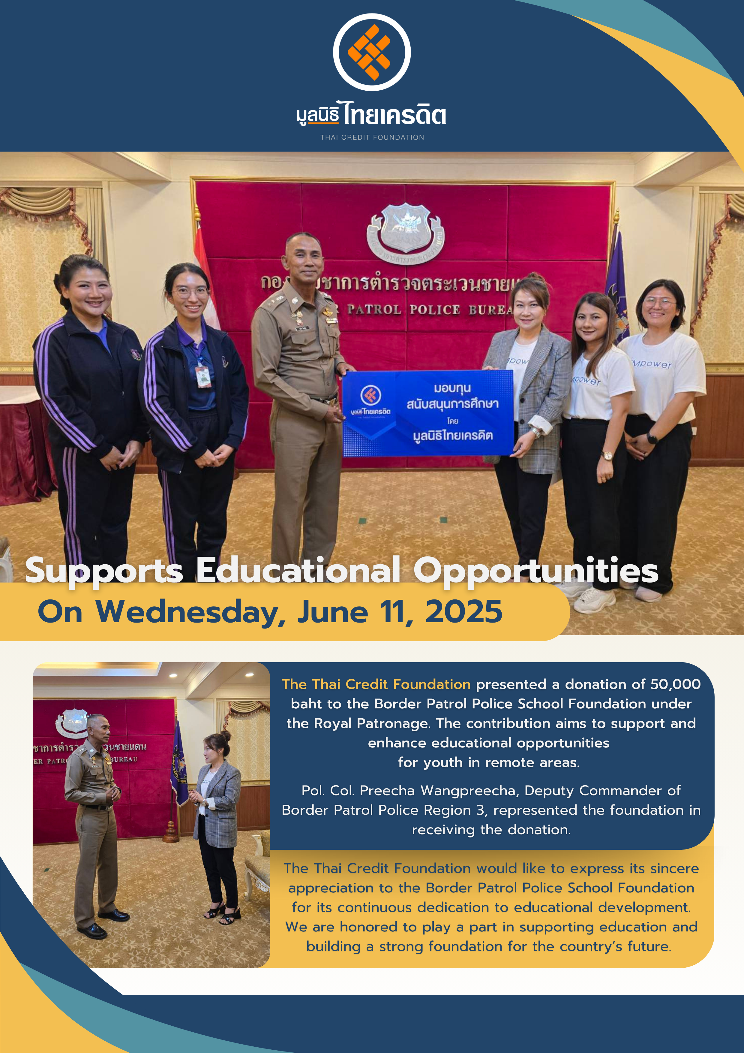 On Wednesday, June 11, 2025, the Thai Credit Foundation presented a donation of 50,000 baht to the Border Patrol Police School Foundation under the Royal Patronage. The contribution aims to support and enhance educational opportunities for youth in remote areas.