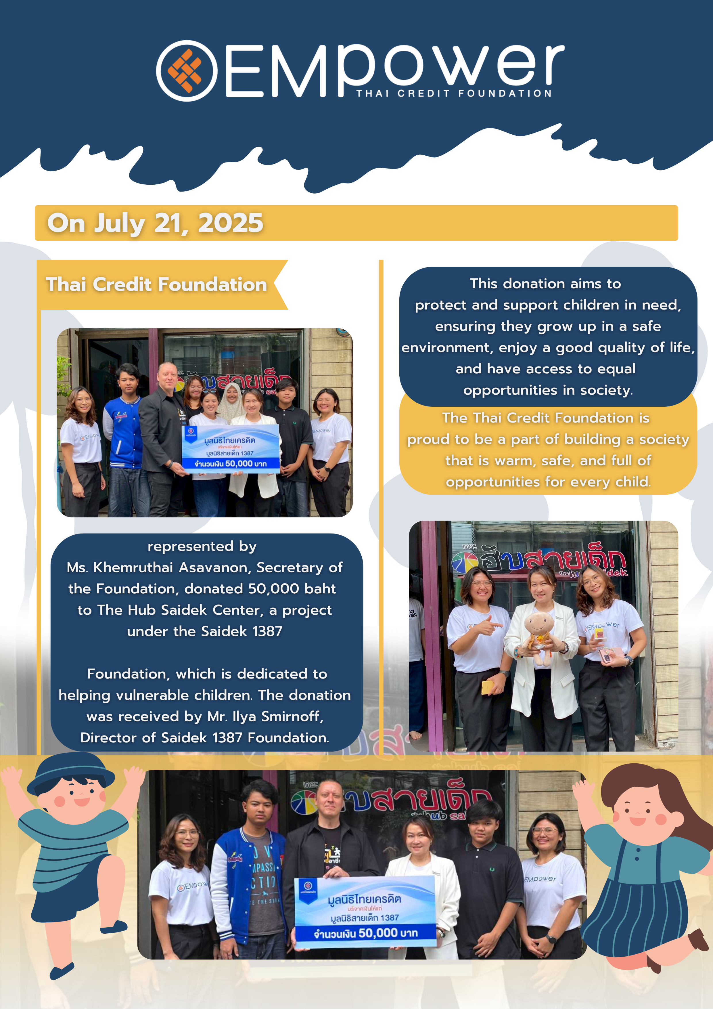 On July 21, 2025, the Thai Credit Foundation, represented by Ms. Khemruthai Asavanon, Secretary of the Foundation, donated 50,000 baht to The Hub Saidek Center, a project under the Saidek 1387 Foundation, which is dedicated to helping vulnerable children. The donation was received by Mr. Ilya Smirnoff, Director of Saidek 1387 Foundation.