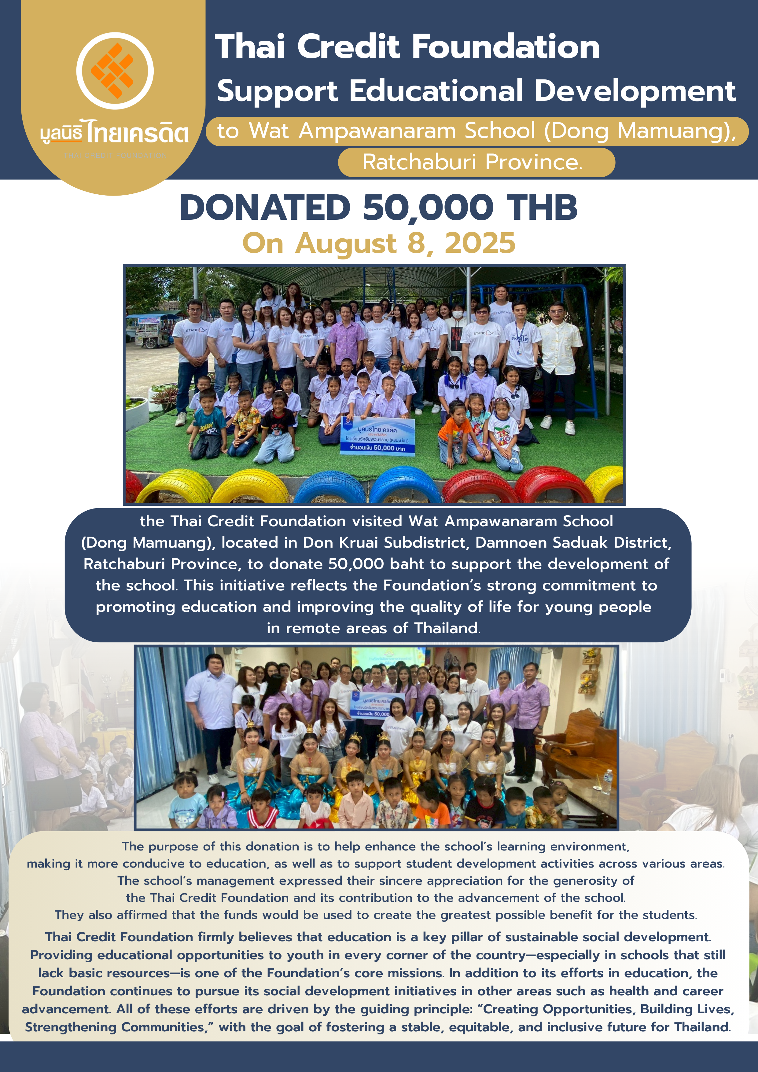 On August 8, 2025, the Thai Credit Foundation visited Wat Ampawanaram School (Dong Mamuang), located in Don Kruai Subdistrict, Damnoen Saduak District, Ratchaburi Province, to donate 50,000 baht to support the development of the school. This initiative reflects the Foundation’s strong commitment to promoting education and improving the quality of life for young people in remote areas of Thailand.