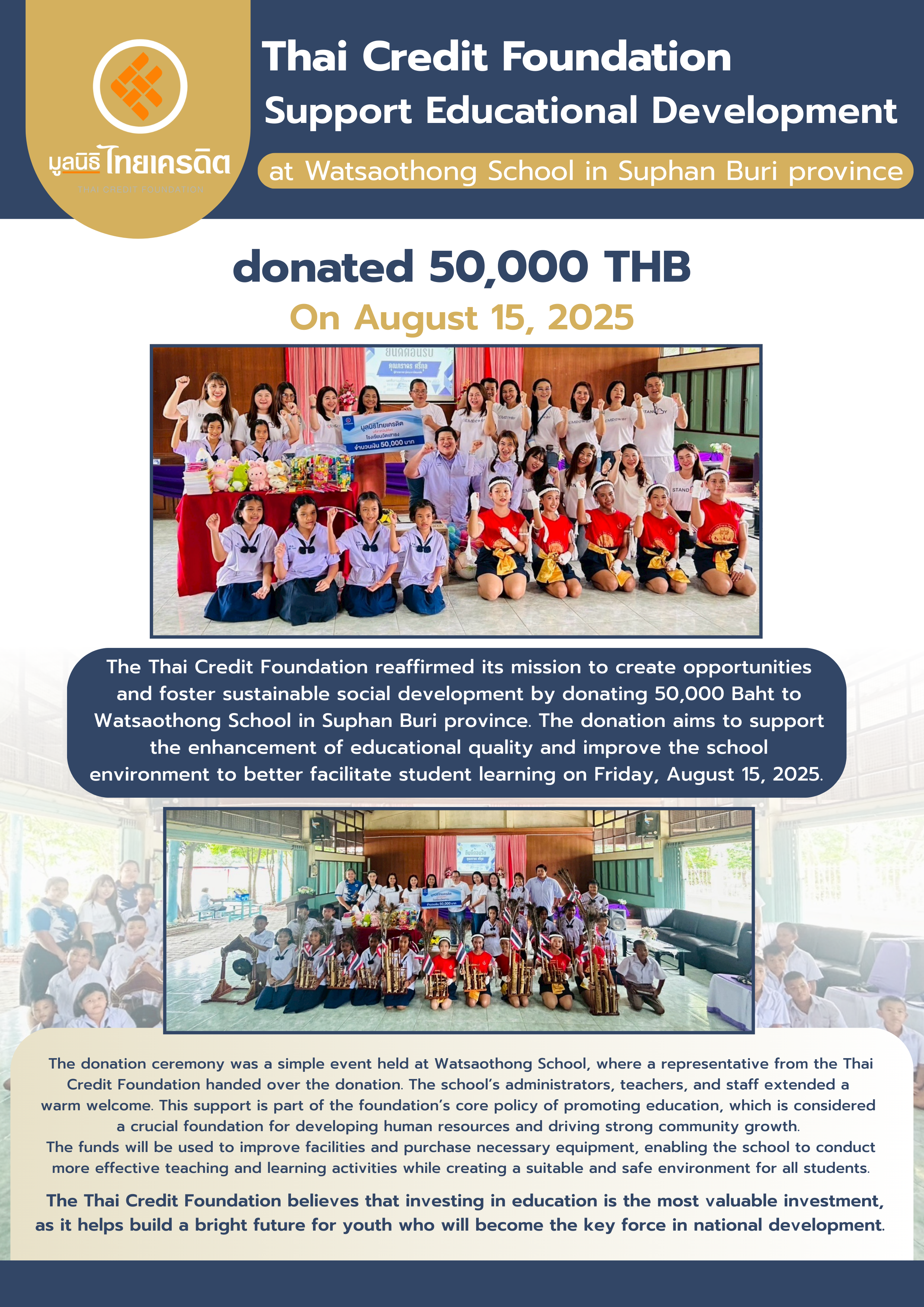 The Thai Credit Foundation reaffirmed its mission to create opportunities and foster sustainable social development by donating 50,000 Baht to Watsaothong School in Suphan Buri province. The donation aims to support the enhancement of educational quality and improve the school environment to better facilitate student learning on Friday, August 15, 2025.