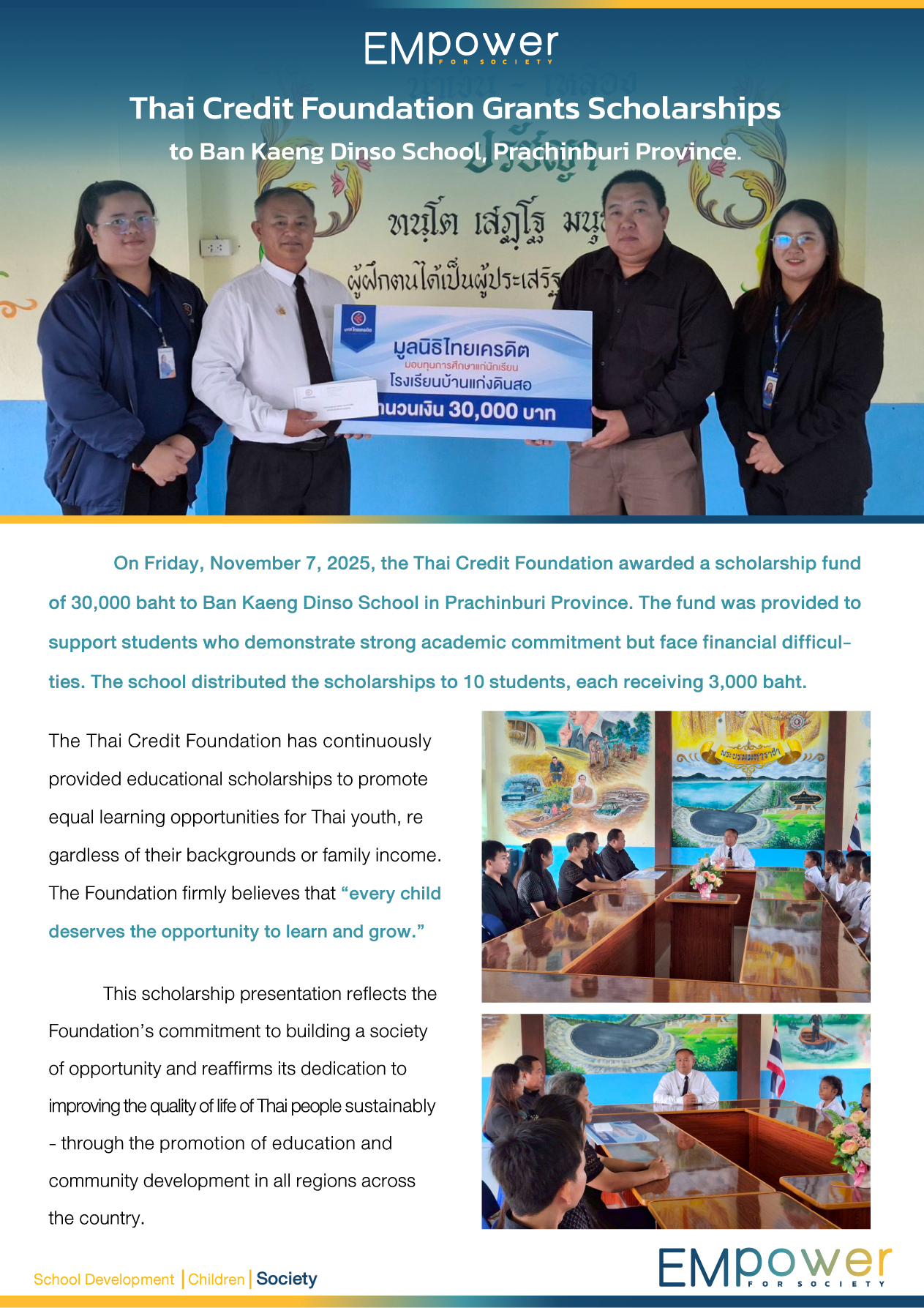 On Friday, November 7, 2025, the Thai Credit Foundation awarded a scholarship fund of 30,000 baht to Ban Kaeng Dinso School in Prachinburi Province. The fund was provided to support students who demonstrate strong academic commitment but face financial difficulties. The school distributed the scholarships to 10 students, each receiving 3,000 baht.