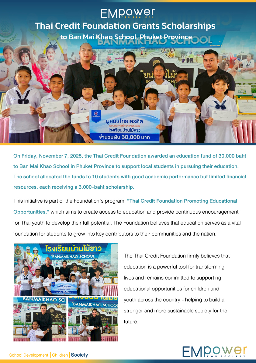 On Friday, November 7, 2025, the Thai Credit Foundation awarded an education fund of 30,000 baht to Ban Mai Khao School in Phuket Province to support local students in pursuing their education. The school allocated the funds to 10 students with good academic performance but limited financial resources, each receiving a 3,000-baht scholarship.