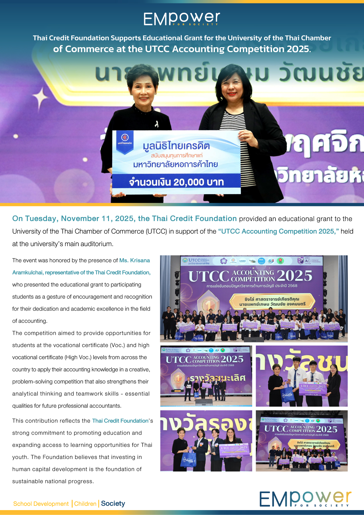 On Tuesday, November 11, 2025, the Thai Credit Foundation provided an educational grant to the University of the Thai Chamber of Commerce (UTCC) in support of the “UTCC Accounting Competition 2025,” held at the university’s main auditorium.