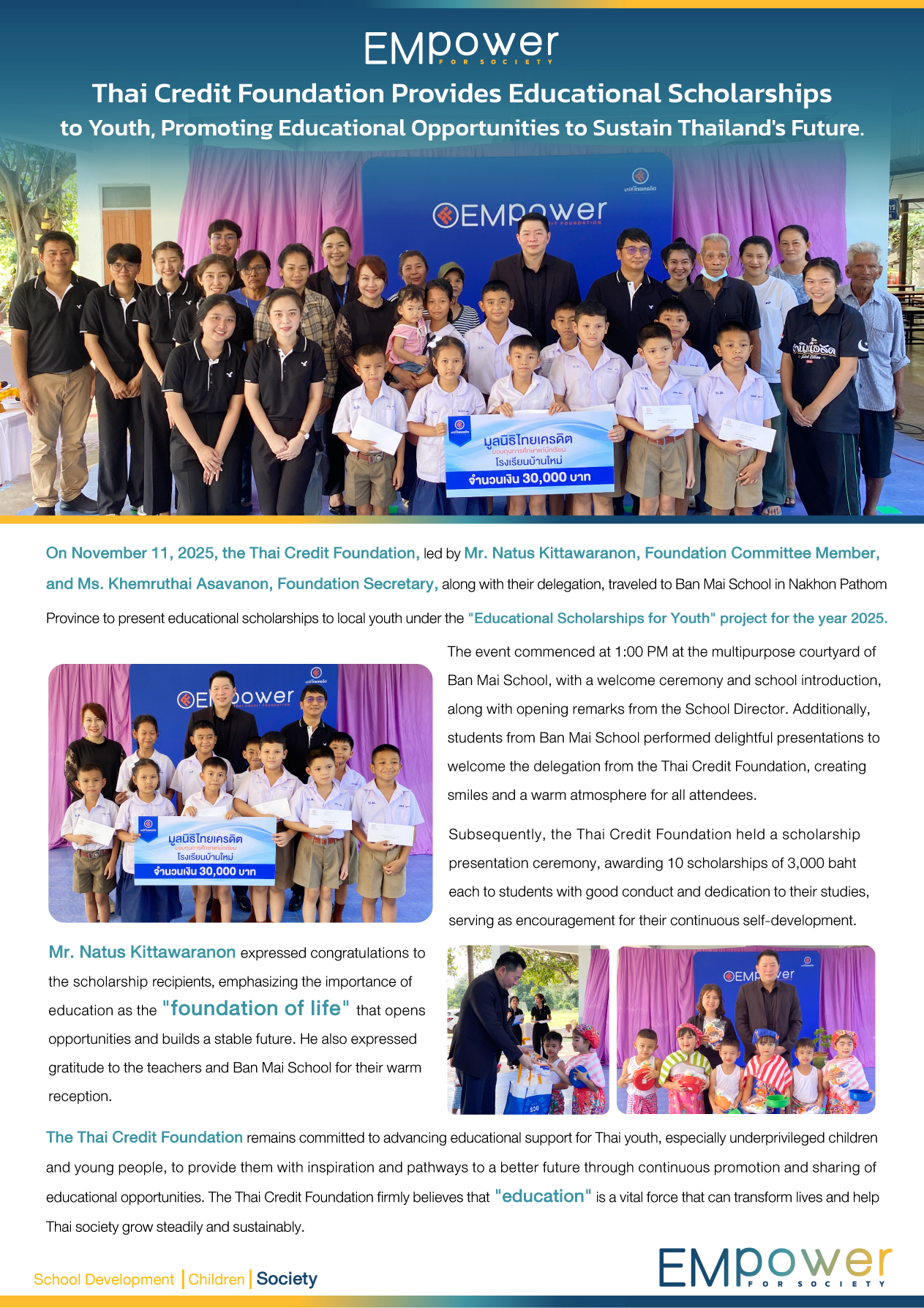 On November 11, 2025, the Thai Credit Foundation, led by Mr. Natus Kittawaranon, Foundation Committee Member, and Ms. Khemruthai Asavanon, Foundation Secretary, along with their delegation, traveled to Ban Mai School in Nakhon Pathom Province to present educational scholarships to local youth under the "Educational Scholarships for Youth" project for the year 2025.