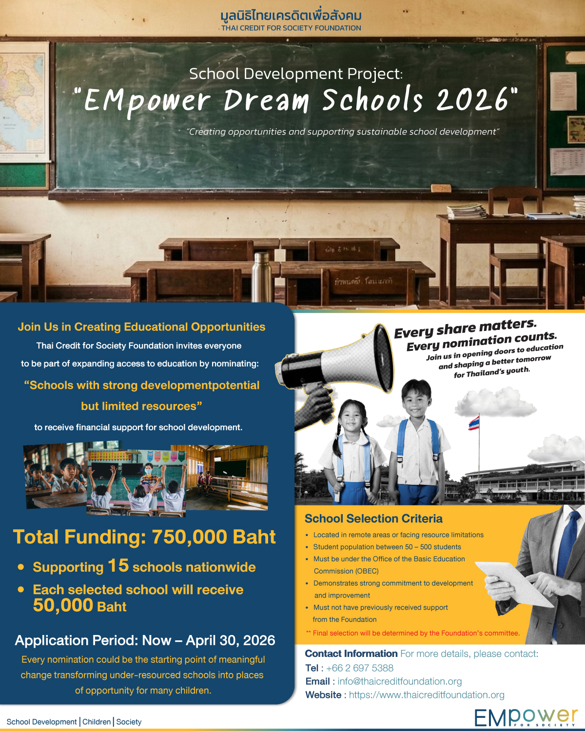 Thai Credit for Society Foundation Invites Nominations for Underprivileged Schools Nationwide under the “EMpower Dream School Development Project 2026”.